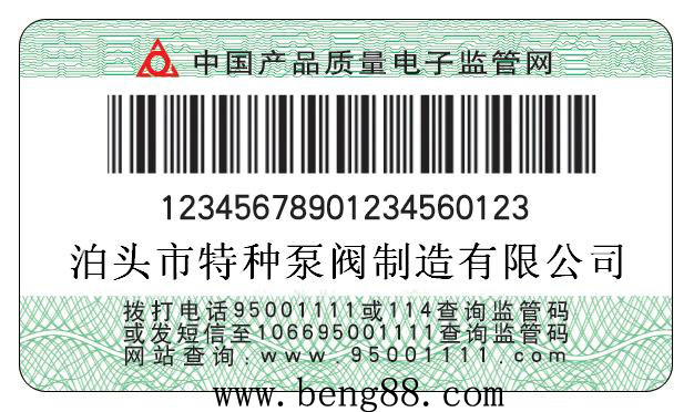 泊頭市特種泵閥制造有限公司自2008年5 月1 日出廠的產(chǎn)品,在產(chǎn)品合格證上粘貼長方形監(jiān)管碼標簽,上有20位數(shù)字,這就是產(chǎn)品監(jiān)管碼。因此,我公司生產(chǎn)的每件產(chǎn)品都將有一個“電子身份證”??梢岳霉潭娫挕⑹謾C短信、互聯(lián)網(wǎng)、超市終端等網(wǎng)絡通訊設備對電子監(jiān)管碼進行查詢,辨別真?zhèn)?。查詢辦法如下: